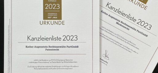 Das FOCUS-Business Magazin hat die gesamte Boutique Kanzlei Kather Augenstein in der aktuelle FOCUS-Kanzleienliste 2023 erneut als eine der TOP-Wirtschaftskanzleien 2023 in Deutschland im Bereich Patent- und Markenrecht ausgezeichnet.