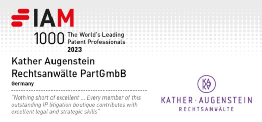 We are pleased that Kather Augenstein has been selected again by IAM Patent 1000 The World’s Leading Patent Professionals as one of the world’s leading law firms in the field of patent infringement in the current 2023 edition.